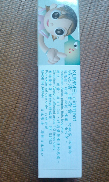 產品介紹: 日本原裝KUMMEL 0intment暗瘡膏(痘必清),在香港非常受歡迎,俗稱大眼妹.對於青春期間由於荷爾蒙作用引致皮脂分泌過盛失調,皮膚表面角質層增厚阻塞皮脂及毛孔出口而引起之暗瘡粉刺。具有殺菌,消炎功效,祛暗瘡/粉刺,清涼舒適,不留印,還能防止皮膚敏感,效果明顯,特別適合於年輕女性皮質使用。